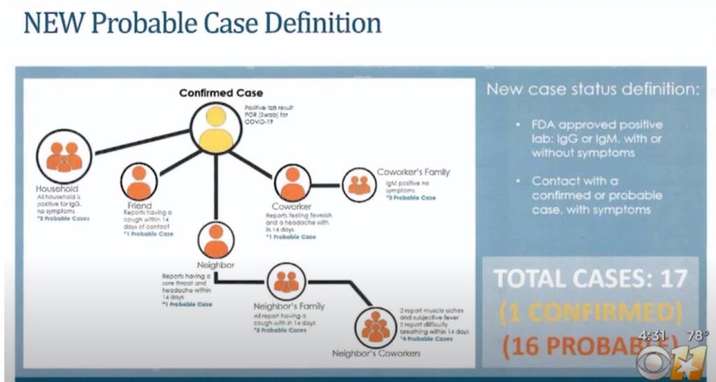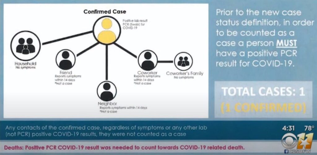 Multiple videos of a meeting of county commissioners in Collin County, Texas, in which the newly adopted CDC guidelines for case counting are clearly spelled out, have been removed from YouTube, so finding them is a challenge. However, the following visual aids used at that meeting by the Collin County Epidemiology Department spokesperson to explain the new counting methods highlight the problem very effectively. Everything in the visual presentation is based on the CDC's Interim Case Definition from April 5th, 2020.