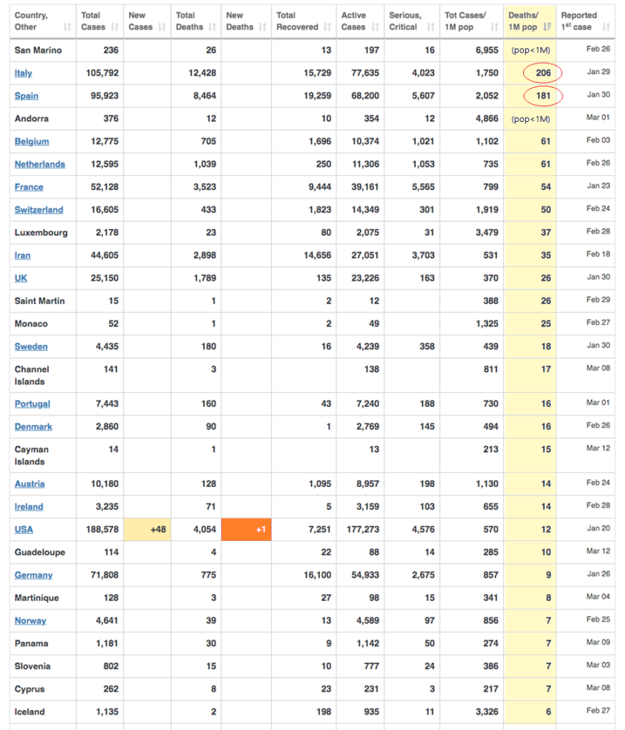 While most of us understand that a viral illness can exacerbate an existing health problem and turn a bad condition into a fatal one, we also realize that this is not new to Covid-19. What is new is hearing the scientific advisor explain that Italy is using a different method to code their deaths than other countries are using – a "generous" method, as he put it – and we should note that important distinction as we react to the numbers, so we can put them into context.